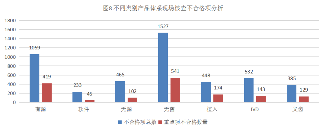 从不同类别的产品不合格项数量分布的情况来看,如下图所示,无菌产品共开具不合格项1527条,有源产品共开具不合格项1059条,较其他类型产品显著增加,一方面与无菌、有源类产品申报数量相对较高有关,另一方面也说明有源产品部分生产企业质量管理体系基础比较薄弱,运行能力和有效性不足;无菌类产品复杂,要求相对较高,企业容易出现管控不到位的情况。后续将分专题探讨分析各类产品不合格项具体情况。