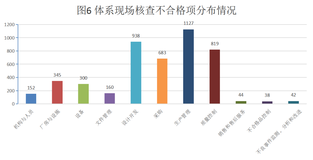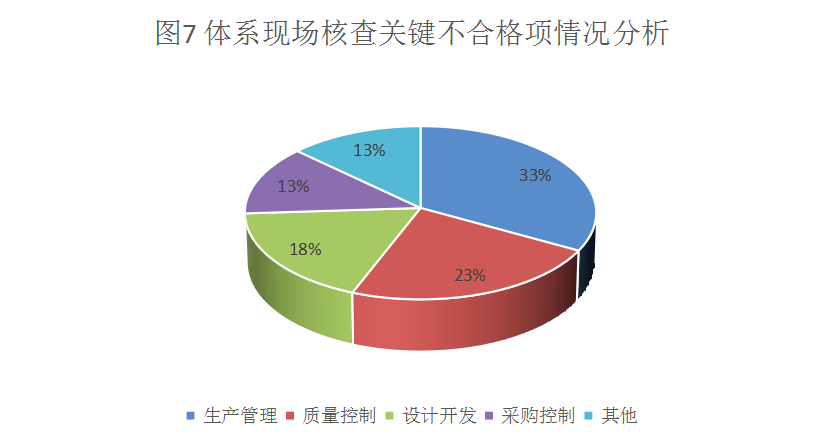 2021年度共完成现场核查909件,累计发现不合项4648条,平均每次核查开具不合格项至少5条。其中生产管理、质量控制、设计开发、采购控制四部分的不合格项数量占总数的77%。